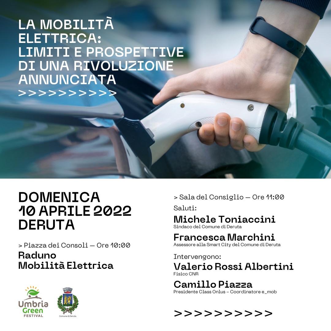 Si terrà domenica 10 Aprile, di concerto con l’Amministrazione Comunale di Deruta, l’evento organizzato da Umbria Green Festival, sulla mobilità elettrica: un’intera mattinata, nel cuore del paese italiano più famoso per le ceramiche, dove si tratterà approfonditamente di problematiche e sviluppi della mobilità alternativa per eccellenza. L’evento, interamente a titolo gratuito, si svolgerà fra le vie del borgo umbro.