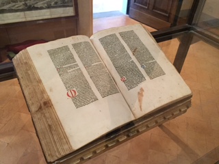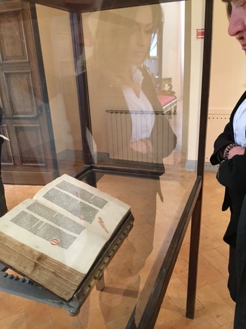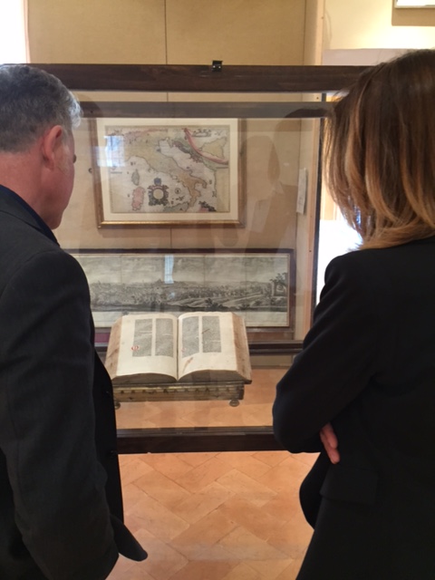 Nel frattempo, al di là della parete della sala conferenze del palazzo tuderte, tre opere rare hanno dato il benvenuto ai visitatori: un’edizione pregiata del documento storico noto come ‘La regola’ di San Francesco d’Assisi, realizzata a Venezia nel 1474, e due vedute di Roma di fine Cinquecento.