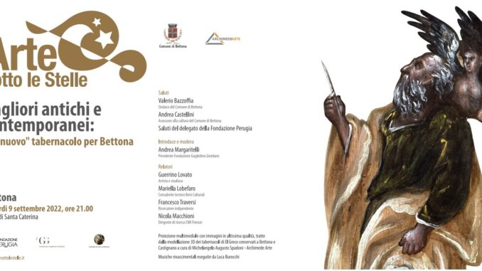 Venerdì 9 settembre, alle 21, l’Arena di Santa Caterina a Bettona, ospita l’evento “Bagliori antichi e contemporanei: un nuovo tabernacolo per Bettona”, organizzato dal Comune e da Archimede Arte, nell’ambito della rassegna “Arte sotto le stelle”, dedicata al tabernacolo di El Greco.