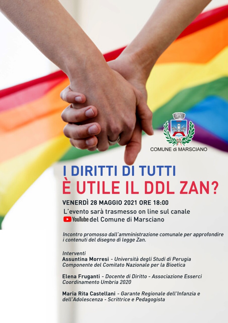 Il Disegno di legge Zan e la tutela dei diritti. L’amministrazione comunale di Marsciano promuove un momento di approfondimento sul tema. L’incontro, in programma venerdì 28 maggio, sarà trasmesso online sulla pagina YouTube dell’ente.