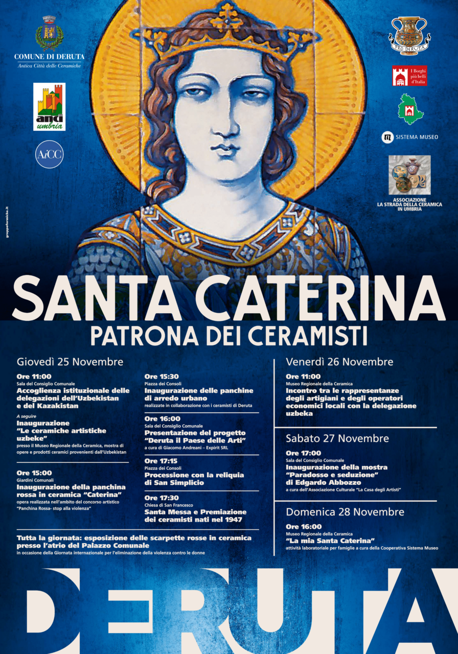 A Deruta tornano i festeggiamenti per la Festa di Santa Caterina, dopo la pausa imposta dalla pandemia. Per giovedì 25 novembre è stato organizzato un fitto e ricco programma di eventi e di iniziative per celebrare la santa patrona dei ceramisti nel segno della tradizione, ma anche con un occhio rivolto al futuro, grazie alle relazioni internazionali e culturali promosse dall’Amministrazione Comunale.