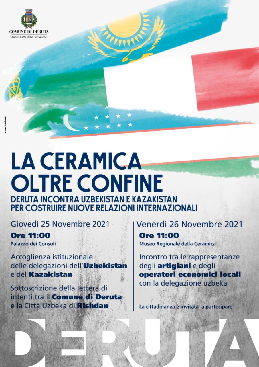 Il via alla festa verrà dato dal direttore della banda cittadina, schierata di fronte all’ingresso del Comune, alle ore 11 quando saranno intonati gli inni dell’Uzbekistan, del Kazakistan e, oltre che quello italiano, in segno di benvenuto alle delegazioni dei due Paesi in questi giorni in visita nella Città della Ceramica. Il sindaco Michele Toniaccini riceverà poi gli ospiti nella Sala Consiliare dove tra l’altro verrà sottoscritta una lettera d’intenti tra il governatore del Distretto di Rishdan* (Uzbekistan), Sufkhonjon Soliev, e il primo cittadino derutese, a sigillo del percorso che le due realtà intendono intraprendere in vista del futuro gemellaggio.