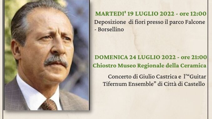 L’Amministrazione Comunale rende omaggio al giudice Paolo Borsellino con un momento di raccoglimento e la deposizione di una corona di fiori presso il Parco “Falcone e Borsellino” di Deruta, domani, martedì 19 luglio alle ore 12.00. E domenica 24 luglio alle ore 21.00 presso il Chiostro del Museo si terrà il concerto di Giulio Castrica e del “Guitar Tifernum ensemble” di Città di Castello, a cura dell’Assessorato alla Cultura del Comune di Deruta con la collaborazione dell’Associazione “La Casa degli Artisti di Perugia”.