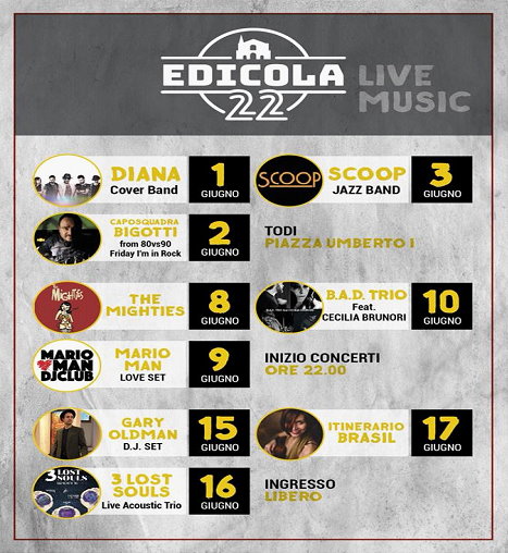 Sempre ottima musica, gruppi live e dj set, con ingresso gratuito. Si potranno degustare ottimi drink e ascoltare musica. C’è il live del venerdì e il dj set del sabato o il jazz della domenica, serata che invece comincerà alle 19. Un motivo in più per passare delle giornate a Todi già dal pomeriggio per poi concludersi tutti insieme la sera in Edicola tra un drink, musica live e panorami unici.