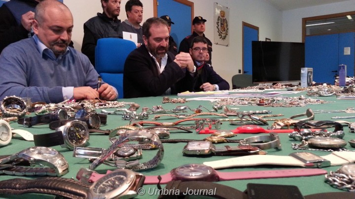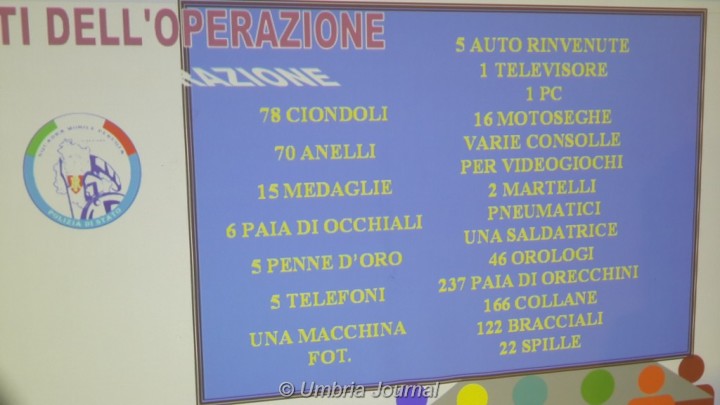 Il bottino ammonta a circa 100 mila euro: si tratta di 78 ciondoli, 70 anelli, 15 medaglie, 6 paia di occhiali, 5 penne d’oro, 5 telefoni, una macchina fotografica, 5 auto rinvenute, un televisore, un pc, 16 motoseghe, varie consolle per videogiochi, 2 martelli pneumatici, una saldatrice, 46 orologi, 237 paia di orecchini, 166 collane, 122 bracciali e 22 spille.