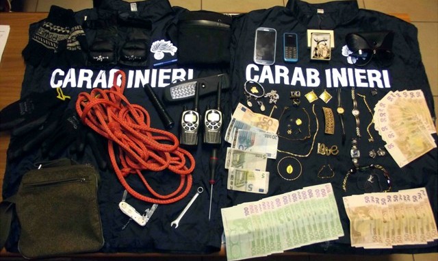 I Carabinieri nel frattempo individuano l’appartamento adocchiato dai due: seguono attimi concitati, ma l’azione è fulminea. Appena usciti di casa i due albanesi, entrambi irregolari sul Territorio Nazionale e con numerosi precedenti di Polizia vengono bloccati dai militari nonostante i due tentino ancora di dileguarsi e guadagnare la via di fuga a piedi. I Carabinieri recuperano l’intero bottino ammontante a circa un migliaio di euro di valore. La perquisizione dell’auto e degli appartamenti usati dai ladri come basi logistiche consentono agli inquirenti di recuperare circa tremila euro in contanti, sicuro provento dell’attività illecita, computer portatili bracciali, catenine e anelli in oro. Ma oltre a queste anche radioline ricetrasmittenti, torce elettrice, guanti in lattice e addirittura una fune, forse utilizzata per calarsi dai balconi delle case.