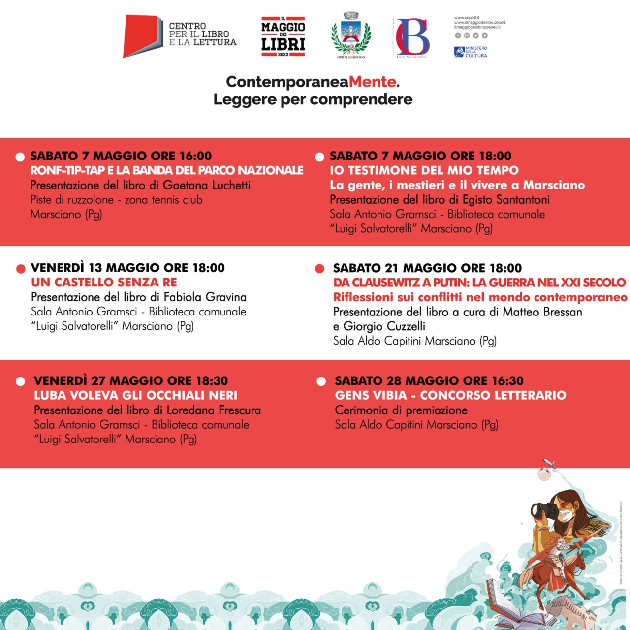 Sono 6 gli appuntamenti che il Comune di Marsciano organizza nel mese di maggio in occasione della campagna nazionale “Il maggio dei libri” finalizzata a promuovere la lettura anche in contesti diversi da quelli tradizionali al fine di poter interessare quante più persone possibili. Un calendario di eventi ricco promosso dall’Ente in collaborazione con associazioni del territorio, tra cui Asd Ruzzolone G. Moretti, Pegaso, Intra e Pro-loco di Marsciano.Da ufficio stampa Comune di Marsciano