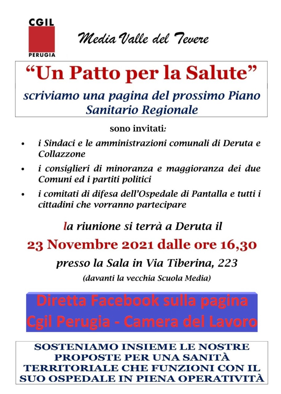 È un percorso lungo e articolato di partecipazione e confronto con le istituzioni quello che vedrà domani la sua tappa conclusiva: a Deruta l’appuntamento è alle ore 16.30 presso la sala in via Tiberina 223, (davanti alla vecchia scuola media) per definire gli ultimi contenuti del “Patto per la salute della Media Valle del Tevere”, una riflessione corale e propositiva sul sistema sanitario di un pezzo importante di territorio umbro.