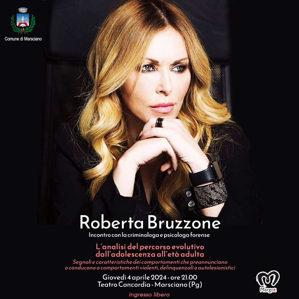La criminologa e psicologa forense Roberta Bruzzone è la protagonista di un incontro in programma giovedì 4 aprile 2024 alle ore 21.00 presso il Teatro Concordia di Marsciano. Tema dell’incontro è un’analisi dei segnali e caratteristiche che negli adolescenti preannunciano o conducono a comportamenti violenti, delinquenziali o autolesionistici. L’iniziativa è promossa e organizzata dal Comune di Marsciano in collaborazione con l’associazione Libertas Margot, una rete di professionisti che da oltre 10 anni è impegnata nella lotta contro ogni forma di violenza.