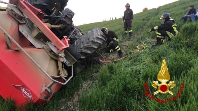 Un uomo di 51 anni, residente a Collazzone, è rimasto schiacciato dal ribaltamento di un trattore. La tragedia è accaduta in località Monte Castello di Vibio, intorno alle 18,30. Sul posto i vigili del fuoco del distaccamento di Todi, un’ambulanza del 118 e la polizia di Stato. L’uomo lavorava all’interno di un terreno di proprietà di una azienda Agricola del posto. Quando il mezzo si è ribaltato stava spargendo del concime.