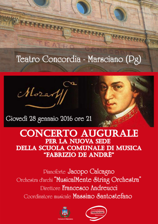 È un concerto augurale, per il trasferimento in una nuova e più ampia sede, quello che propone la Scuola comunale di Musica “Fabrizio De André” per giovedì 28 gennaio 2016 presso il teatro Concordia alle ore 21.00.