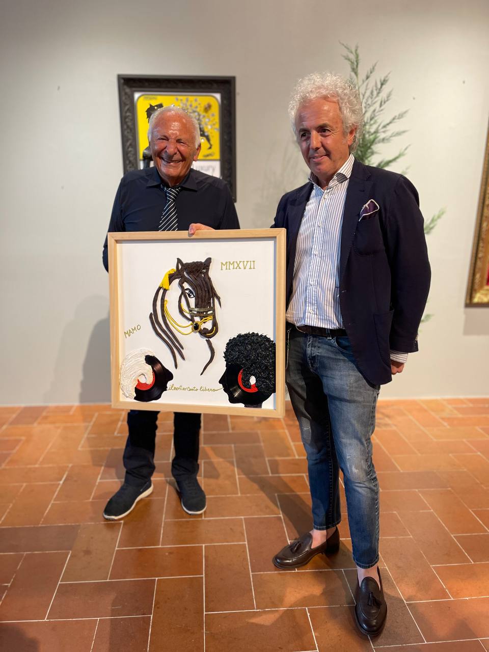 “Sono stato molto contento quando ho visto Mogol entrare in sala. Avevo realizzato questo quadro nel 2017 – spiega MaMo – ispirandomi a vari temi che hanno legato questi due grandi artisti a partire dall’inserimento di due dischi, perché loro ne hanno venduti tantissimi, che li rappresentano e che sono collegati tra loro da un fiume di parole che, nel mio caso, sono ‘il nostro canto libero’, che riprende il titolo della celebre canzone ‘il mio canto libero’. Nella parte superiore del quadro c’è un cavallo che rappresenta il mitico viaggio, fatto da Battisti e Mogol nel giugno del 1970. I due artisti partirono a cavallo da Milano fino ad arrivare a Roma, fu un viaggio rivoluzionario per l’epoca”.